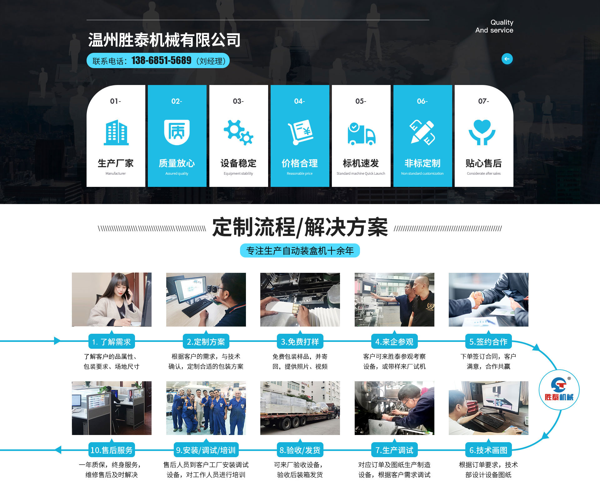 溫州勝泰機(jī)械有限公司位于東海之濱, 坐落于"包裝機(jī)械城"-溫州市。集研發(fā)、生產(chǎn)、經(jīng)貿(mào)于一體的現(xiàn)代化科技型企業(yè),是國(guó)家高新技術(shù)企業(yè),通過(guò)了CE認(rèn)證、IS09001質(zhì)量體系認(rèn)證,并獲得了多項(xiàng)專利。從事盒裝紙包裝設(shè)備10余年,具有先進(jìn)的技術(shù)力量和生產(chǎn)工藝,制造經(jīng)驗(yàn)豐富、產(chǎn)品質(zhì)量可靠、價(jià)格合理、能為廣大客戶提供設(shè)備、技術(shù)、原材料供應(yīng)全方位服務(wù),幫助客戶打造專業(yè)化、智能化、無(wú)人化的工業(yè)4.0工廠。